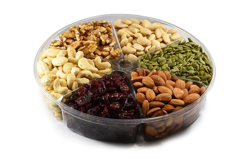 Free Shipping The happy heart gift tray is filled with healthy snack items that can satisfy a desire for a crunchy or chewy snack. Tart dried fruit will awaken your tastebuds. You’ll taste a buttery flavor and a hint of sweetness when munching on cashews and almonds. The walnuts have a unique flavor combination of fruitiness and tanginess. The pumpkin seeds in this collection add a pleasant earthy flavor to the mix.