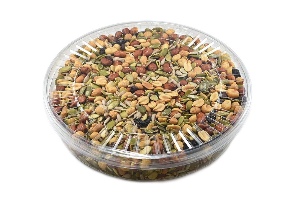 It may take a few minutes of gazing at this Hi-Energy Trail Mix Gift Tray for you to see the many diverse ingredients that make up this energizing mix. The nuts, seeds and soybeans were selected for this mix because of their flavors and energizing qualities. Raisins add some sweetness and chewy texture to counter the crunchiness of the other ingredients. You can’t overlook the addition of carob chips.
