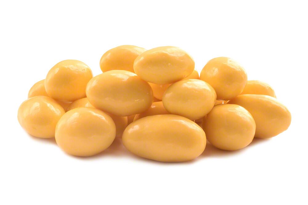 White Chocolate (Sugar, Cocoa Butter, Whole Milk Powder, Soy Lecithin – an emulsifier, Natural Vanilla Flavor), Confectioners Coating (Sugar, Palm Kernel and Palm Oil, Whey Powder, Nonfat Milk Powder, Soy Lecithin – an emulsifier, Vanilla), Almonds, Natural Flavor, Tapioca Dextrin, Confectioners Glaze, Color Added (Yellow 5 Lake), Contains Almonds, Milk and Soy.