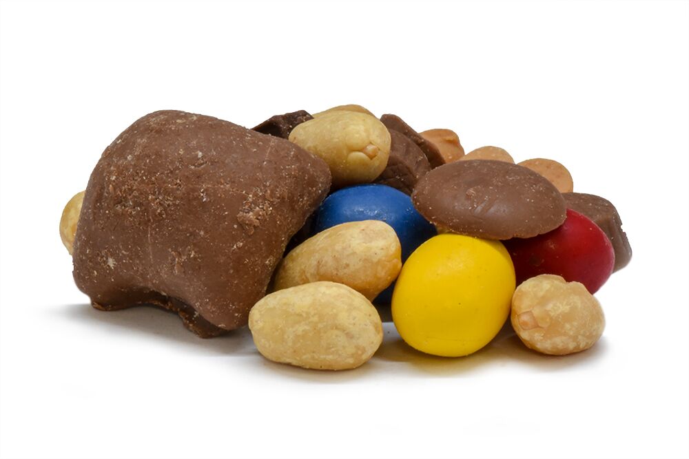ROASTED SALTED PEANUTS, CHOCOLATE CHIPS, PEANUT BUTTER CHIPS, MILK CHOCOLATE PEANUT GEMS, PEANUT BUTTER FILLED PRETZEL NUGGETS, MINI PEANUT BUTTER CUPS.