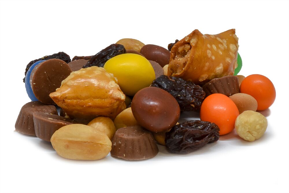 ROASTED SALTED PEANUTS, THOMPSON SEEDLESS RAISINS, PEANUT BUTTER CHIPS, PEANUT BUTTER FILLED PRETZEL NUGGETS, MILK CHOCOLATE PEANUT GEMS, MINI PEANUT BUTTER CUPS.